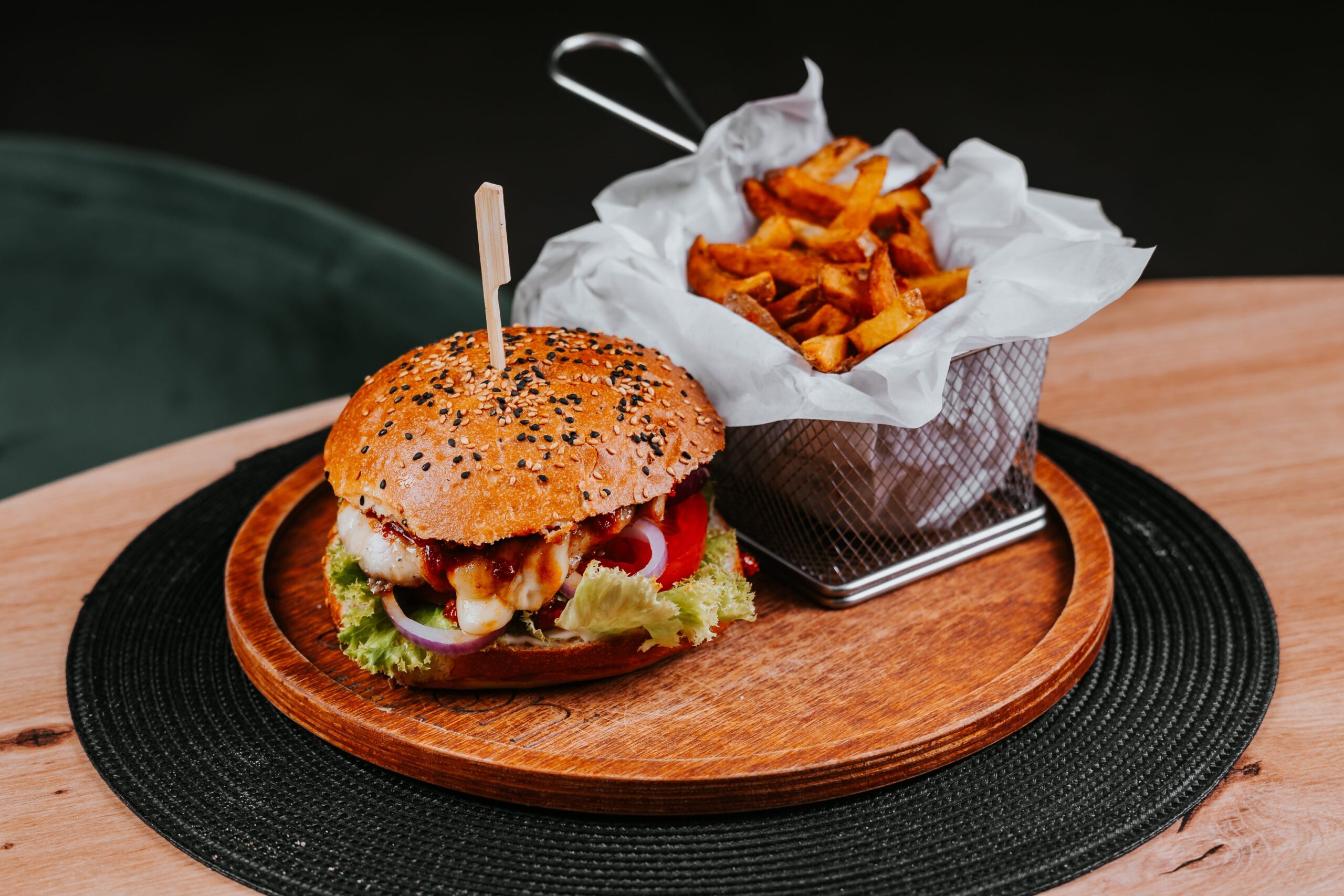 Csirke burger,hasábburgonya (házi buci,chorizo lekvár, mozzarella, paradicsom, lilahagyma, saláta, majonéz)