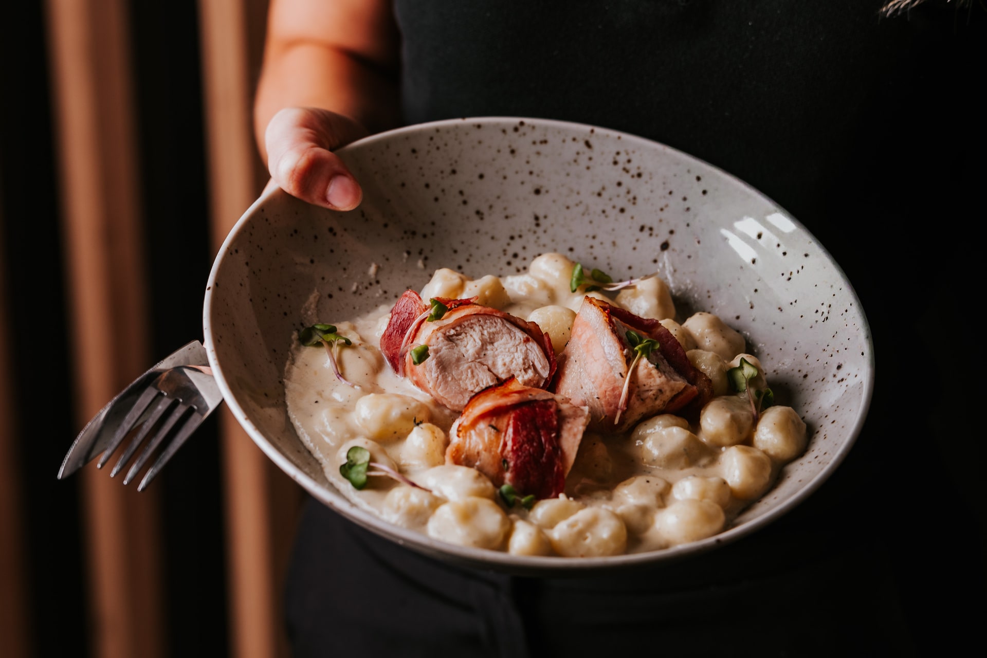 Szalonnába tekert csirke falatkák, gorgonzolás gnocchi